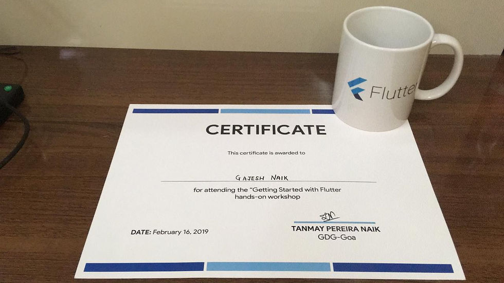 Google Developer Group Goa organized workshop on Flutter at 91Springboard Panaji today. You may be aware that Flutter is an open-source mobile application development SDK created by Google. It is used to develop applications for Android and iOS, as well as being the primary method of creating applications for Google Fuchsia. The workshop was conducted by Bhavik Makwana and Sanni Prasad. It is recommend that the details of Flutter can be viewed at https://flutter.io/docs/. Flutter is preferred for its natural feel and look, no limitations, great looking, fast widgets and since it provides 60-120 frames per second. It works on Android Studio, Visual Studio Code (Most recommended) and Intellij Idea. We can get widgets on https://pub.dartlang.org/flutter. Certificate of participation came with Coffee Mug in too appreciation.